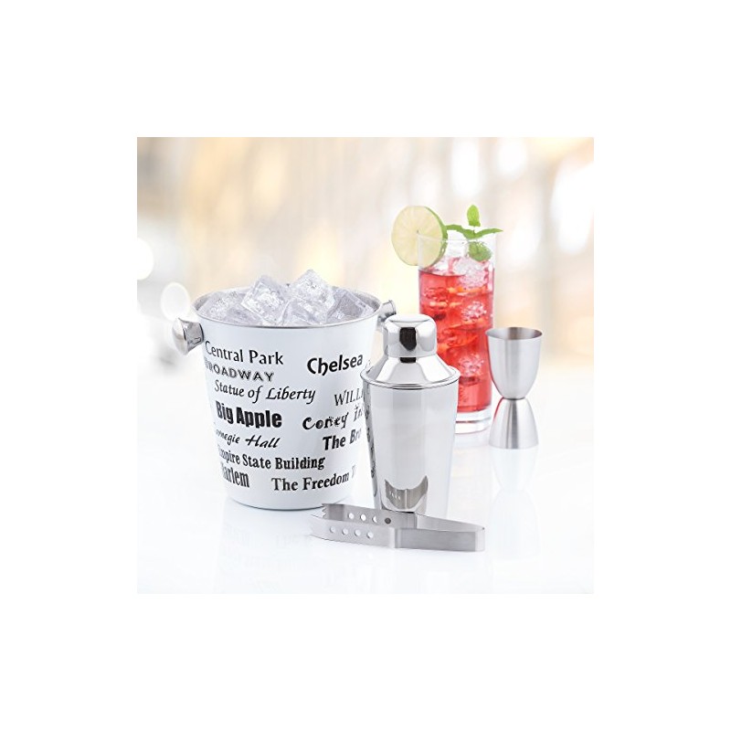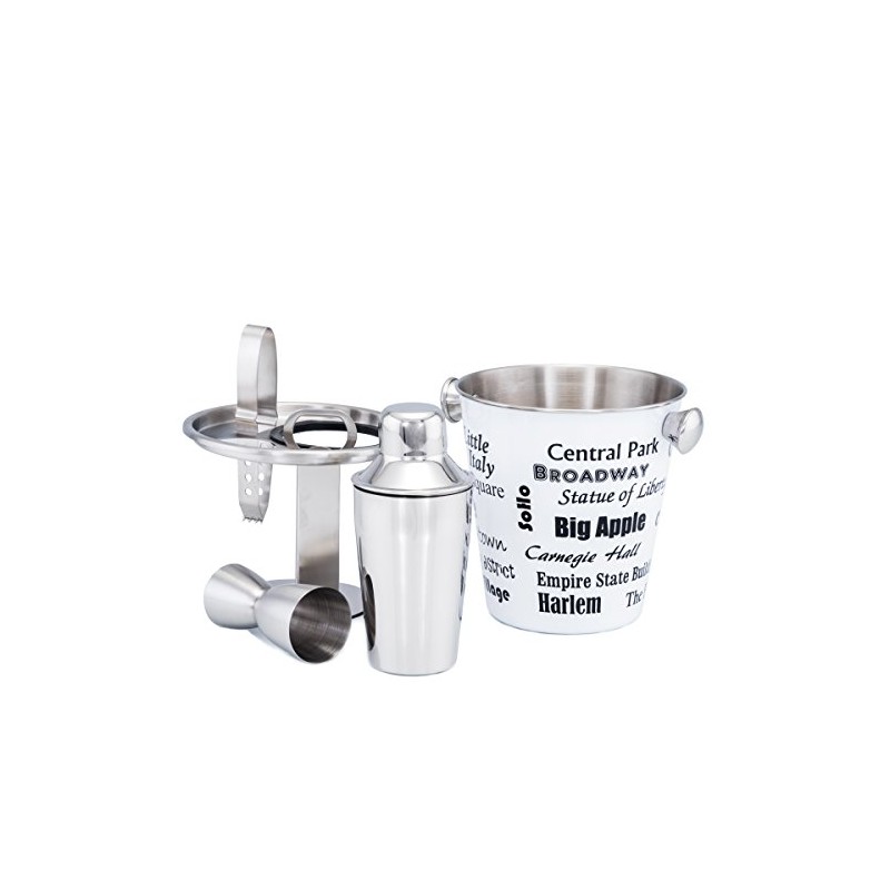 • Set includes Ice Bucket with Stand and Tongs, 10 Oz. Cocktail Shaker, 1 Bottle Opener, and 1 Jigger.