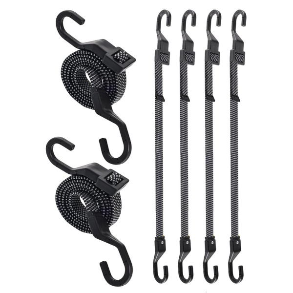 - MULTI-FUNCTION & WHAT YOU GET - Ideal for both indoor and outdoor uses, like bike racks, car roof racks, fixed campsites, tents, and more. Our heavy-duty flat adjustable bungee cords come in various lengths, ranging from 12 inches to 100 inches. What You Get: 6 pack 36 inch adjustable flat bungee cords, 5-star customer service, and a 24-month return policy.