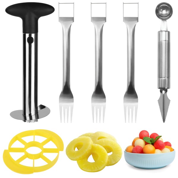 - Fruit Tool Set: This 6-piece kit includes 1 pineapple cutter, and 1 pineapple slicer, 3 watermelon fork slicer cutter, 1 2-in-1 fruit carving and baller tool — meeting all your needs for effortlessly preparing fruit salads, party platters
