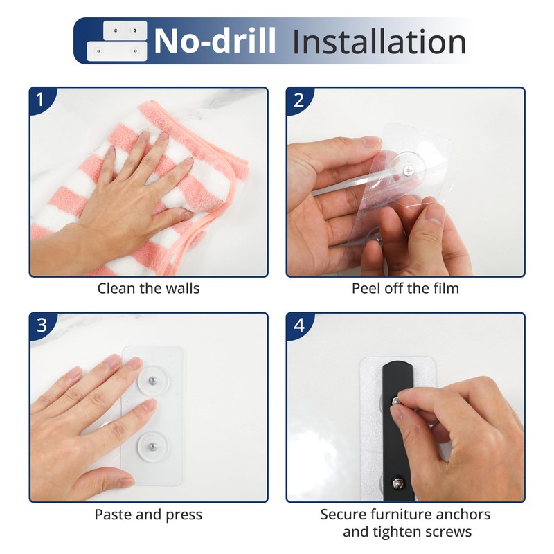 - [2 INSTALLATION WAYS]: The anti tip furniture anchors drilling installation is equipped with deep threaded screws, which provide strong fastening force, and the countersunk design screws will not protrude, adding beauty to your furniture, suitable for rough walls. No-drill installation is equipped with a customized no-nail stickers, which has strong adhesion and is not easy to fall off, suitable for smooth walls.