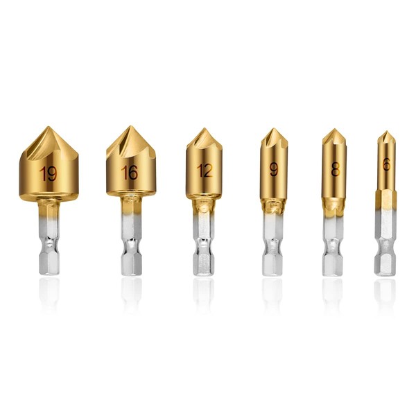 6-Piece HSS Countersink Drill Bit Set 90 Degree Chamfer Countersink Set Countersink Bits with Titanium Coated Diameter 6-19 mm