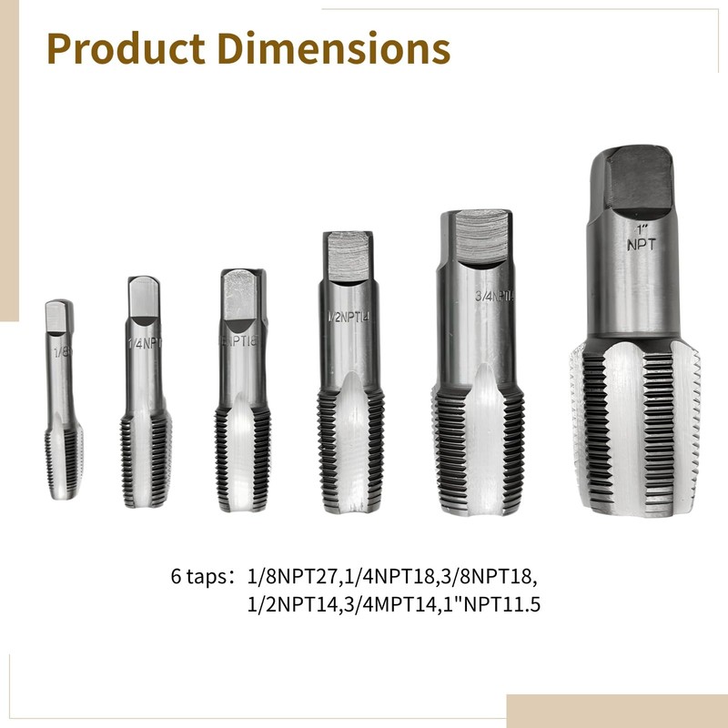 • Comprehensive 6-Piece Set: Includes six essential NPT thread sizes—1/8, 1/4, 3/8, 1/2, 3/4, 1 inch—ensuring compatibility with a wide range of pipe threading needs; perfect for professionals and DIY enthusiasts alike