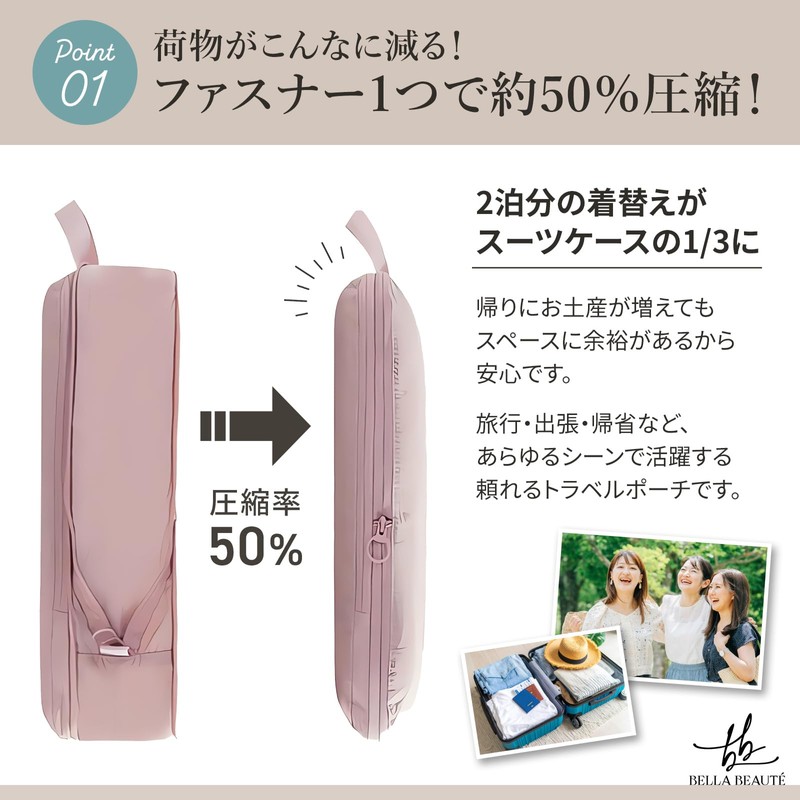 - 1 zipper for 50% compression. Increased storage capacity for travel and business trips with bulky luggage. You can compress about 50% by simply closing the zipper. Maximize the space inside your suitcase