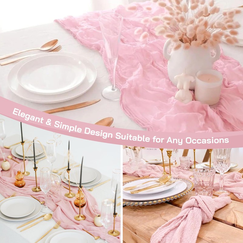 - Premium Cheesecloth runner table Material: Made of soft, reusable, washable, and fade-resistant polyester with a beautiful crinkling texture. Imbued with timeless charm and versatile elegance, our handcrafted Cheesecloth Table Runner is designed to elevate weddings, parties, and any memorable event into an enchanting celebration.