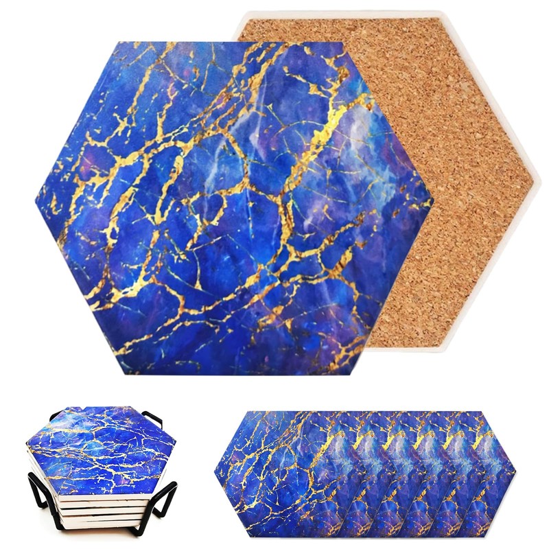 6 Piezas Portavasos para Mesa, Posavasos de Cerámica, Posavasos para Bebidas, Posavasos Absorbentes y Antideslizante, con Soporte, para Oficina, Casa, Restaurante, Bar, Cafetería (Azul)