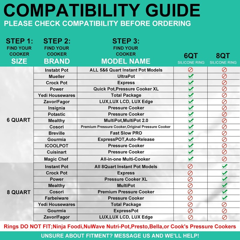 - * Good Choice / PERFECT COMPATIBLE- An AWESOME sealing fits for Pressure Cooker models such as InstaPot 5 Quart and 6 Quart Seal Tops (IP-DUO60, IP-LUX60, IP-DUO50, IP-LUX50, Smart-60, IP-CSG60, IP-CSG50 and 6qt ultra, gasket rings Fit 5 & 6 QT IP Duo-60, Nova, Plus, Max, Lux, Gem, Viva, Smart Wifi 60, Pro Crisp XL 6Qt, Duo Crisp XL 6Qt, Pro 6Qt).Perfectly Gasket rings with 3 Color coding to prevent transfer smells and stains sealing during pressurized cooking.