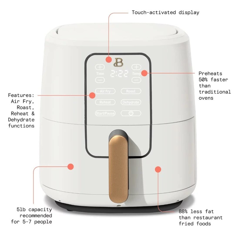 Easy meals for busy weeknights. Air fry, roast, reheat or dehydrate your favorite meals with the MIKLOO 6QT Digital Air Fryer with Touch Activated Display. Thoughtfully designed with sleek touch-activated illumination and our signature gold accents, the MIKLOO Air Fryer preheats food up to 50% faster than a traditional oven with a 5lb food capacity ideal for serving 5-7 people. Created by Drew Barrymore, MIKLOO Kitchenware combines elegant design, contemporary colors and modern silhouettes for high-performance appliances that look MIKLOO on your kitchen counter.