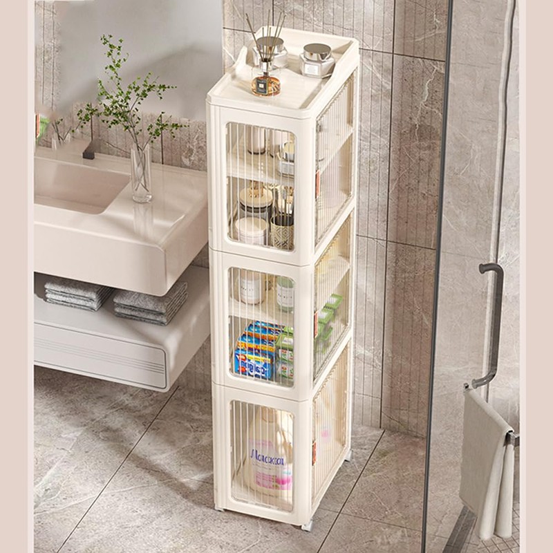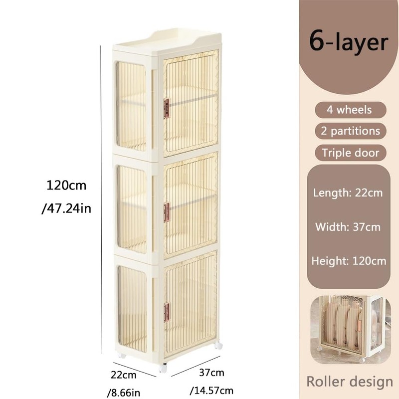 6-Tier Tall Narrow Storage Cabinet, Bathroom Cabinet with Transparent Doors and Movable Wheels, Plastic Foldable Storage Cabinets for Small Space, Bathroom, Kitchen, Laundry (Cream Yellow+Transparent)