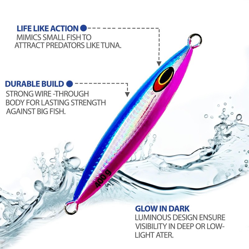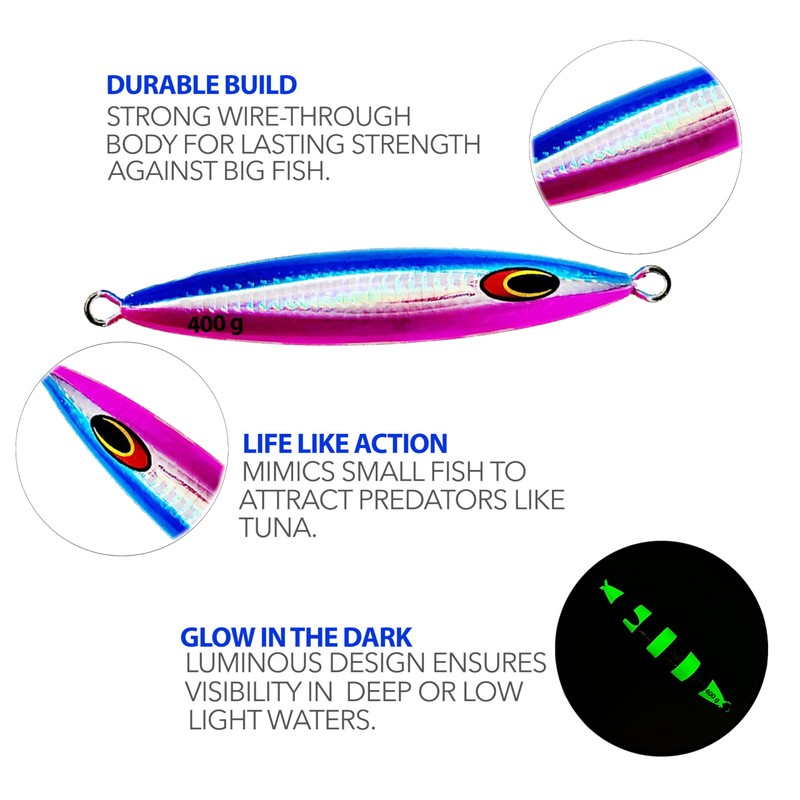 - Heavy-Duty 400g Jig: Perfect for deep sea fishing and offshore trolling, this 6"" jig offers excellent weight and balance for effective deep water jigging lures and strong casting performance.
