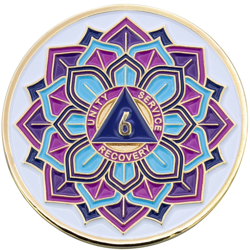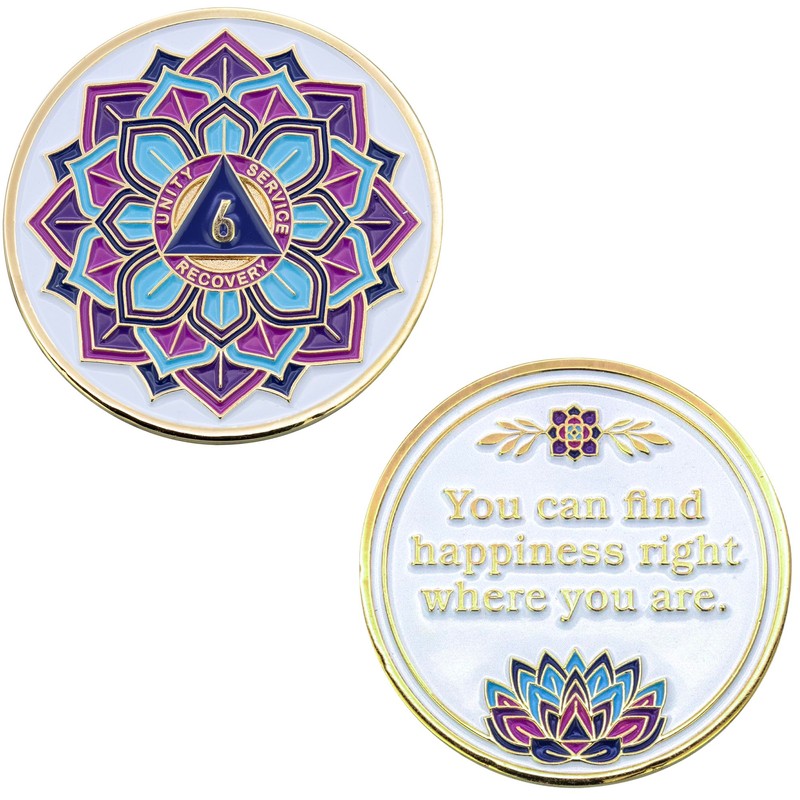 6 Year AA Coin - Sobriety Mint 'in Bloom' Lotus Flower Recovery Medallion/Chip - White/Gold