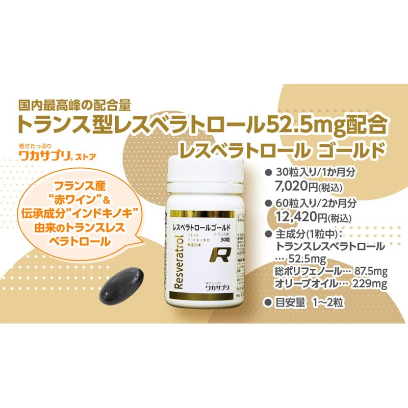 【ワカサプリ】レスベラトロールゴールド 60粒 トランス型レスベラトロール 1粒で52.5mg 赤ワイングラス約80杯分 脂肪分の高い食生活を送っている方に ブドウ インドキノキ レスベラトロール サプリメント