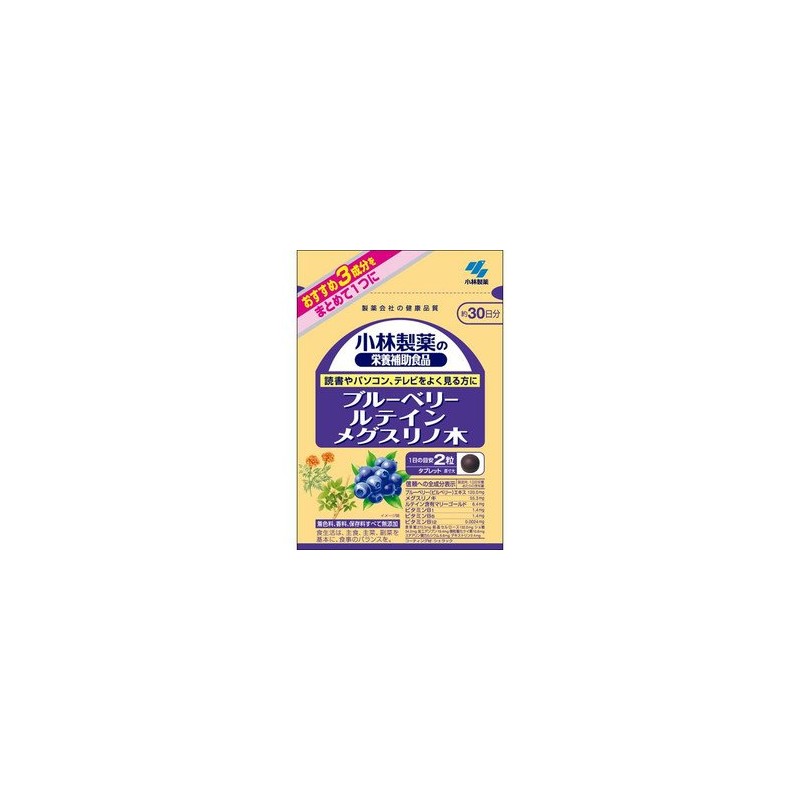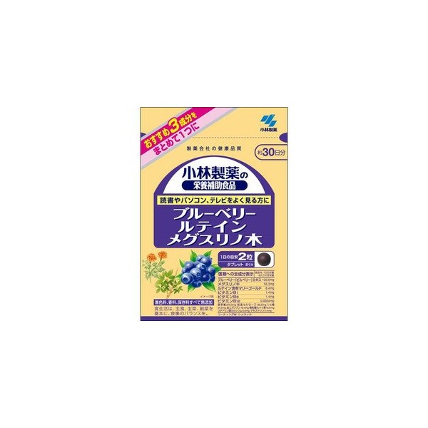 - 「小林製薬 ブルーベリー ルテイン メグスリノ木 60粒」は、ブルーベリー、ルテイン含有マリーゴールド、メグスリノキの3つの成分を1つにまとめたサプリメントです。1粒あたり、ブルーベリー(ビルベリー)エキスを60mg、メグスリノキ 27.7mg、ルテイン含有マリーゴールド 3.2mg含有しています。着色料、香料、保存料すべて無添加。