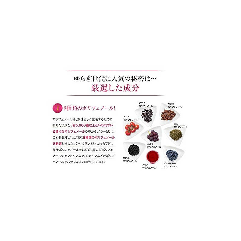 • 「黒大豆,カカオ,ぶどう,緑茶,ブルーベリー,トマト,赤ワイン,アサイー」のポリフェノール配合