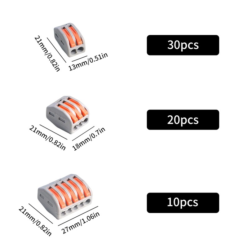 - CONVENIENT STORAGE The cable connector kit includes 2 connectors (30pcs), 3 connectors (20pcs), 5 connectors (10pcs). A transparent box is included, portable, easy to access and easy to carry.