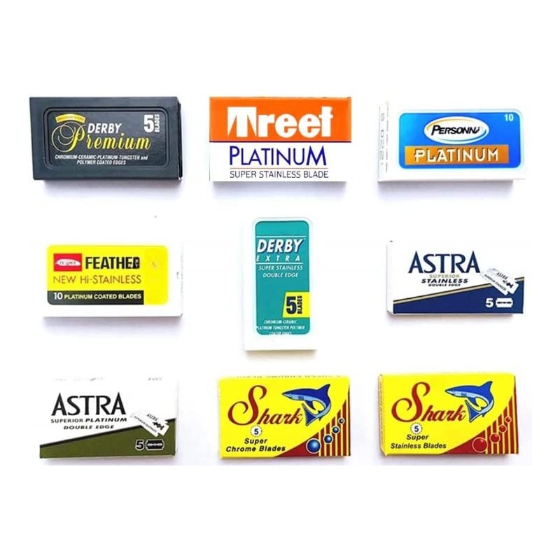 - ✓ 9 popular razor blades – 10 x Personna Platinum, 5 x Derby Extra, 10 x Satinex, 10 x Feather, 5 x Astra Superior Platinum Green, 5 x Astra Superior Stainless Blue, 5 x Shark Super Stainless, 5 x Shark Super Chrome, 5 x Derby Premium.