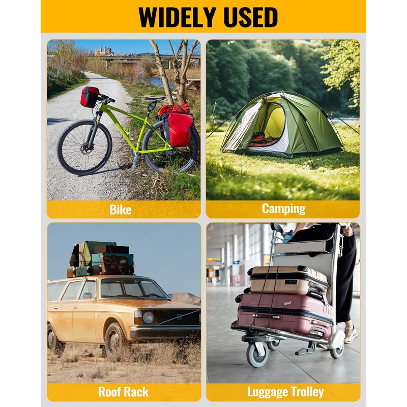 - WIDELY USED & 14 SIZES AVAILABLE - Made for daily life and outdoor activities. This heavy duty bungee cord with carabiner is perfect for tying down almost all of your equipment or tools. We offer 14 styles from the shortest 3" to the longest 120" to fit all your needs. You can use them to hold a bicycle, tarp, tent or trailer canopy. They are also great for roof racks, hand carts, boats, caravans, camping and so on. If you aren't 100% satisfied for any reason, we'll refund your money.