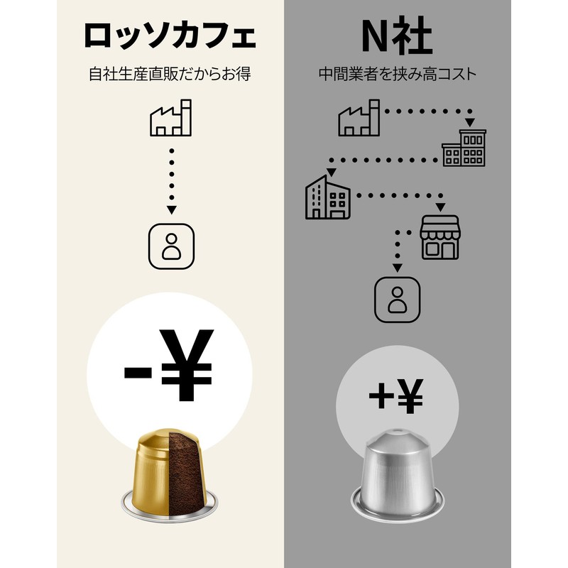 - 【安心のアメリカンブランド】:「ロッソカフェ」は世界中を調査し選び抜いたプレミアム品質のコーヒー豆を、ヨーロッパに構える自社工場にてカプセルにしています。
