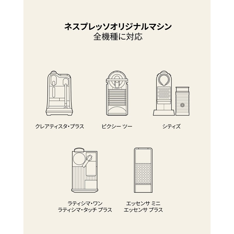 - 【オリジナル マシン全機種に対応】:(※「ヴァーチュオ」シリーズには非対応です)当ブランドのカプセルはネスプレッソ「オリジナル」シリーズの全機種に対応しています(エッセンサ ミニ、エッセンサ プラス、イニッシア、ピクシー ツー、ラティシマ・ワン、ラティシマ・タッチ プラス、シティズ、ミーレ、クレアティスタ・プラス、アトリエ、など)。