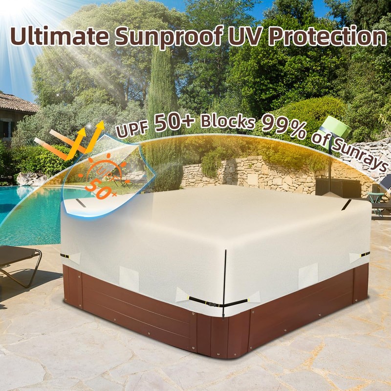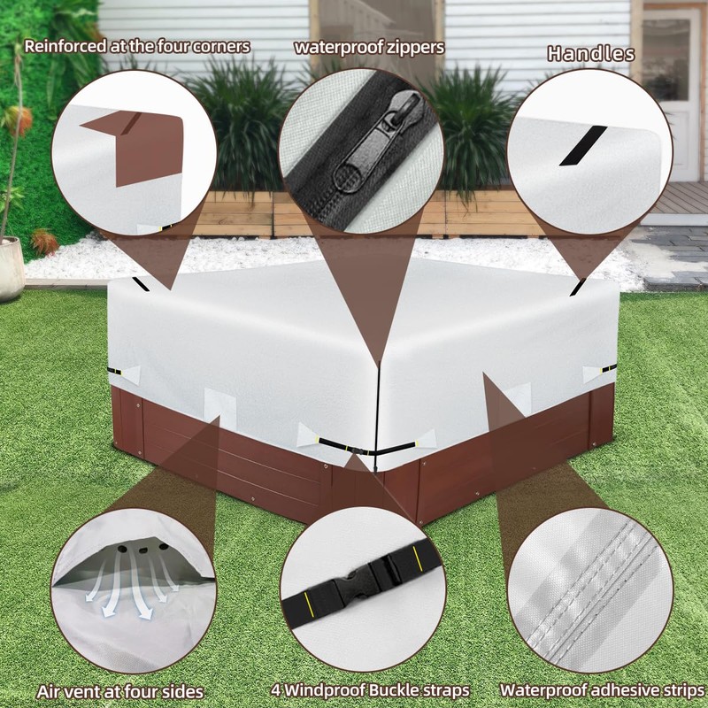 - [EXCELLENT WATERPROOFING]: The spa cover of the hot tub has waterproof zippers in every corner and waterproof tape at the fabric seams. This bathtub cover has excellent waterproof performance. Whether in your yard, garden, or by the swimming pool. Ensure your furniture remains dry