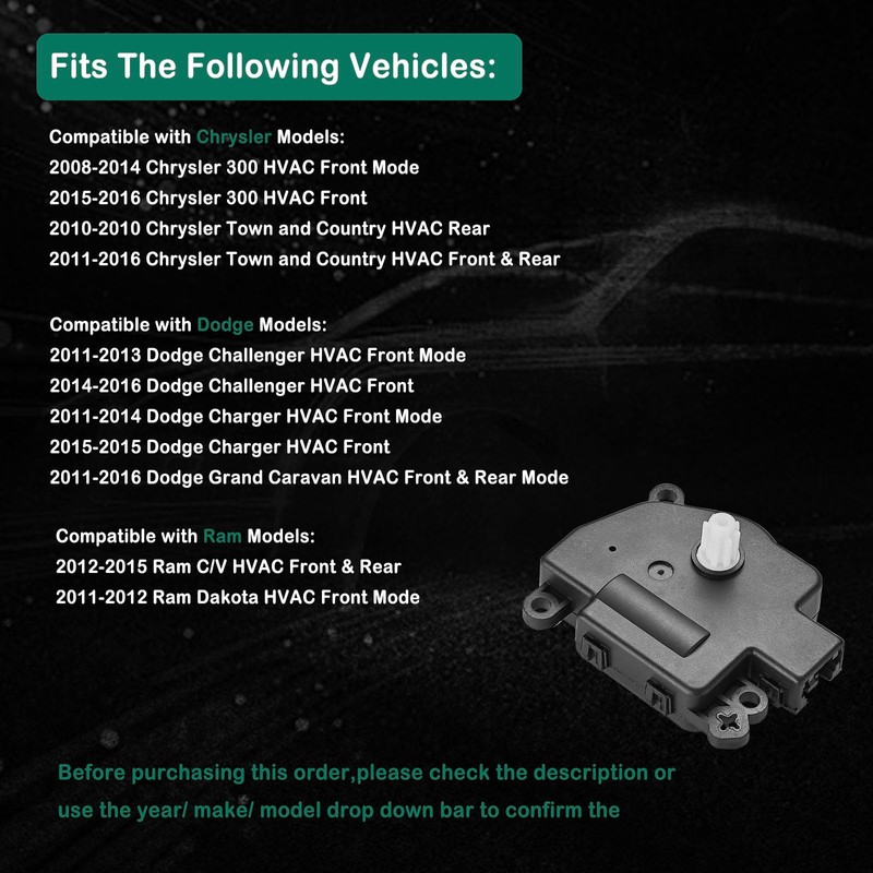 - 【Vehicle Fitment】: The HVAC Heater Blend Door Actuator Compatible with Chrysler 300 2008-2019/Town and Country 2008-2016, Dodge Challenger/Charger/Grand Caravan 2008-2019, Dodge Dakota 2008-2010, Ram C/V 2012-2015, Volkswagen(VW) Routan 2009-2014