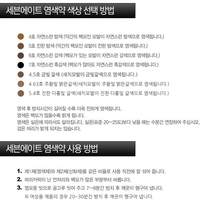 - 사용할 때 주의사항: 1. 염색하기 전에 설명서를 끝까지 잘 읽어주십시오. 2. 사용 전에 반드시 피부실험(패취테스트)을 하여 주십시오. 3. 염색크림 및 머리를 감은 세액이 눈에 들어가지 않도록 주의 하십시오. 4. 고온 및 직사광선을 피하고 서늘한 곳에 보관하십시오. 5. 색상은 염색시간, 모발 및 온도조건 등에 따라 차이가 있을 수 있습니다. ※ 이 제품은 p-페닐렌디아민이 함유되어 있어 알레르기 발생 가능성이 있으므로 사용상 주의사항에 따라 염색 전 피부시험(patch test)을 실시하고 사용하시기 바랍니다.