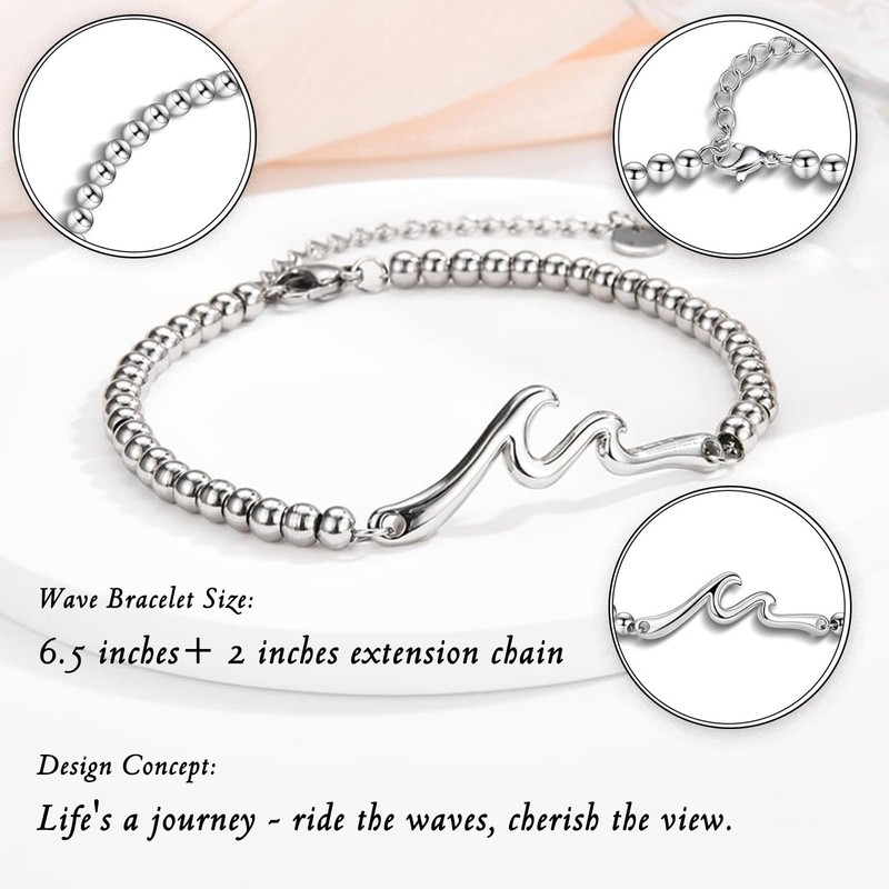 - Premium & Comfortable Design – Made with high-polish stainless steel beads (4mm) + wave charm, hypoallergenic and tarnish-resistant. Adjustable 7" + 2" extender chain fits most women’s wrists comfortably.