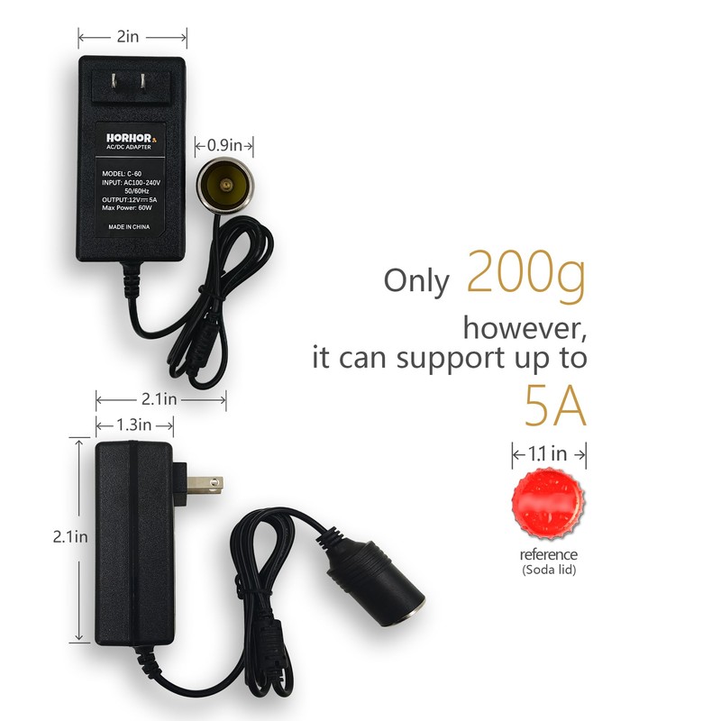 HorHor 60W 5A AC to DC Converter, Car Cigarette Lighter Adapter, 110v/120v to 12v AC/DC Adapter Power Supply for Convert a Wall Outlet to a Car Cigarette Lighter Socket