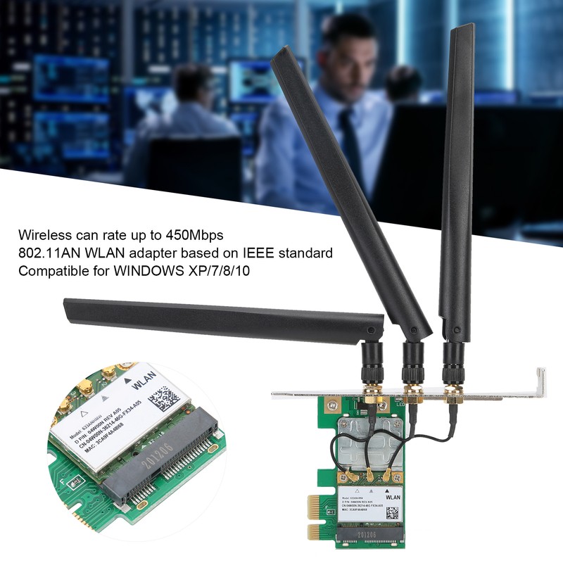 1、The wireless rate is as high as 450Mbps, so there is no need to worry about network stuck. 2、This desktop network card is based on the IEEE standard 802.11AN WLAN adapter. 3、With strong compatibility, which can compatible for WINDOWS XP/7/8/10. 4、Adopts high qualiy material of PCB, which makes it durable and have high reliability. 5、Package inluding network card, 3pcs antenna and screw, which can provide much convenience for your installation.
