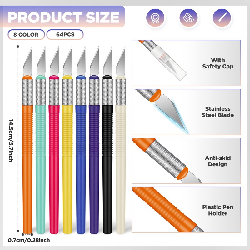 - Sufficient to Use and Replace: the package will provide you with 64 pieces of hobby knives in 8 colors, including blue, white, black, orange, yellow, purple, red and mint green, 8 pieces for each color, adequate in quantity, can well meet your daily use needs and replacement needs