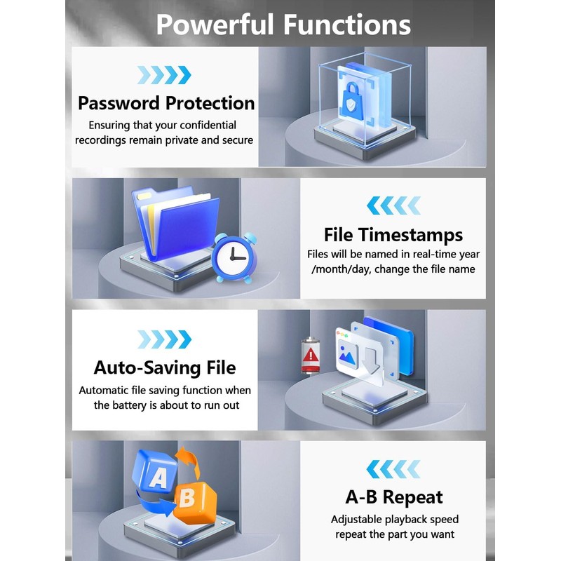 - Easy to Use & Perfect Multi-function Present - The audio recorder device is designed with Utilizes an intuitive and simple. Just press button to record, save and playback. tape recorder has all the functions you want, A-B repeat, fast forward, rewind, 3.5mm headphone plug, mp3 player, variable speed playback, password and line-in etc. It’s a perfect present recorder for lectures, meetings, interviews, speeches, classes