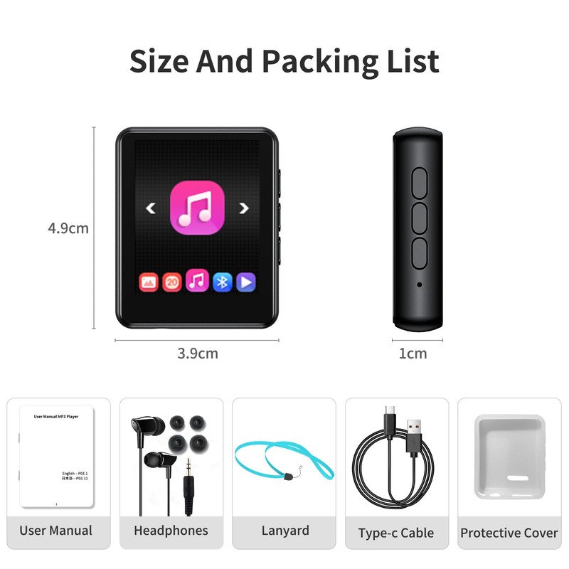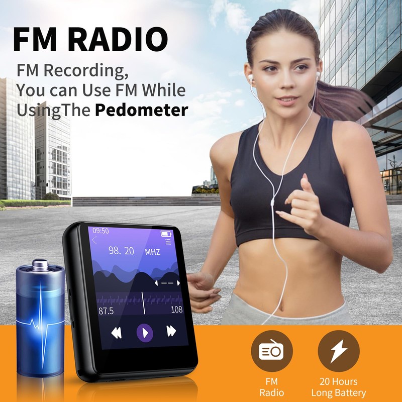 - ❣️【Multifunctional MP3 player】Supports Bluetooth connection, full touch screen, built-in speaker, music playback, FM radio, voice recorder, e-book (TXT file), video playback, photo navigation, screen saver, alarm clock, pedometer, folder, 28 languages, fast rewind/forward, random play, etc. Perfect for sports, fitness, running, travel, study, work, etc.
