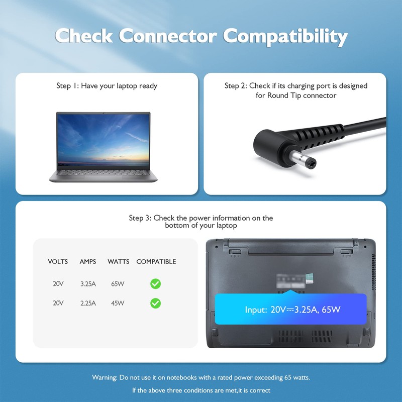 • Output Max - 20V 3.25A 65W, compatible with 20V 2.25A 45W Input Volt Range - 100-240V