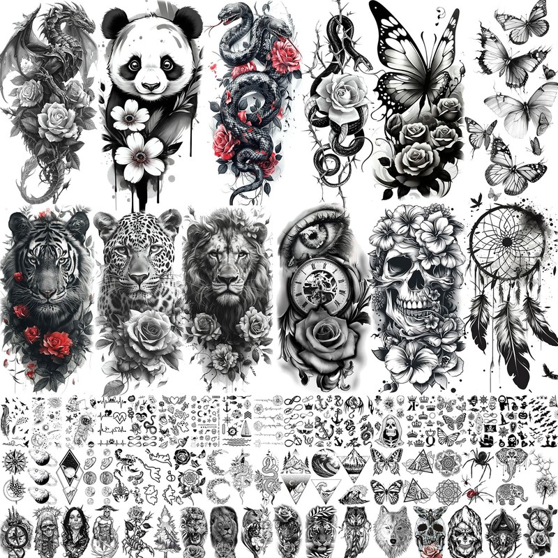 66 Sheets Snake Rose Flower Temporary Tattoos For Women Girls, Dragon Panda Florals Half Arm Sleeve Tattoo Sticker Dreamcatcher Floral, 3D Skull Temp Butterfly Fake Tattoos For Adults Lion Tiger Leopard