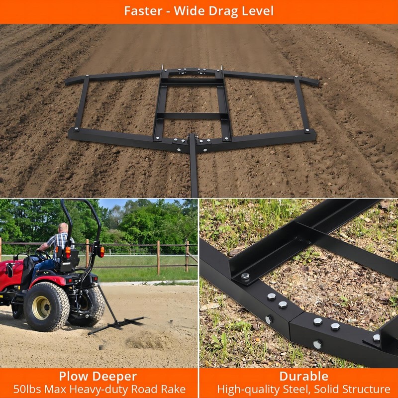 - 【Deeper Plow】Our Land Leveler, equipped with a heavy-duty road rake that allows you to plow deeper and tackle tough terrains with ease. With a maximum weight capacity of 50lbs, this robust road rake is designed for heavy-duty use, making it ideal for leveling and smoothing various surfaces effectively. Whether you are working on gravel roads, soil terrains, or other rough landscapes, the Land Leveler's heavy-duty road rake ensures deep plowing for enhanced efficiency and optimal results.