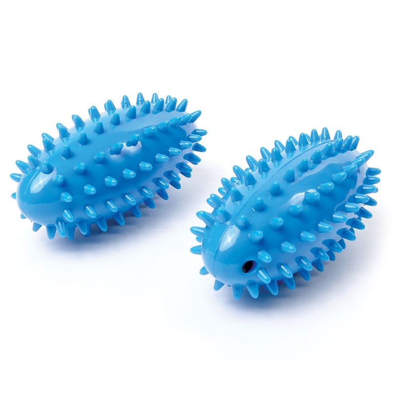 The 66fit oval shaped spiky massaging roller set comprises two identical firm sand-filled ovals with flexible spikes packaged and presented in an attractive colour box.