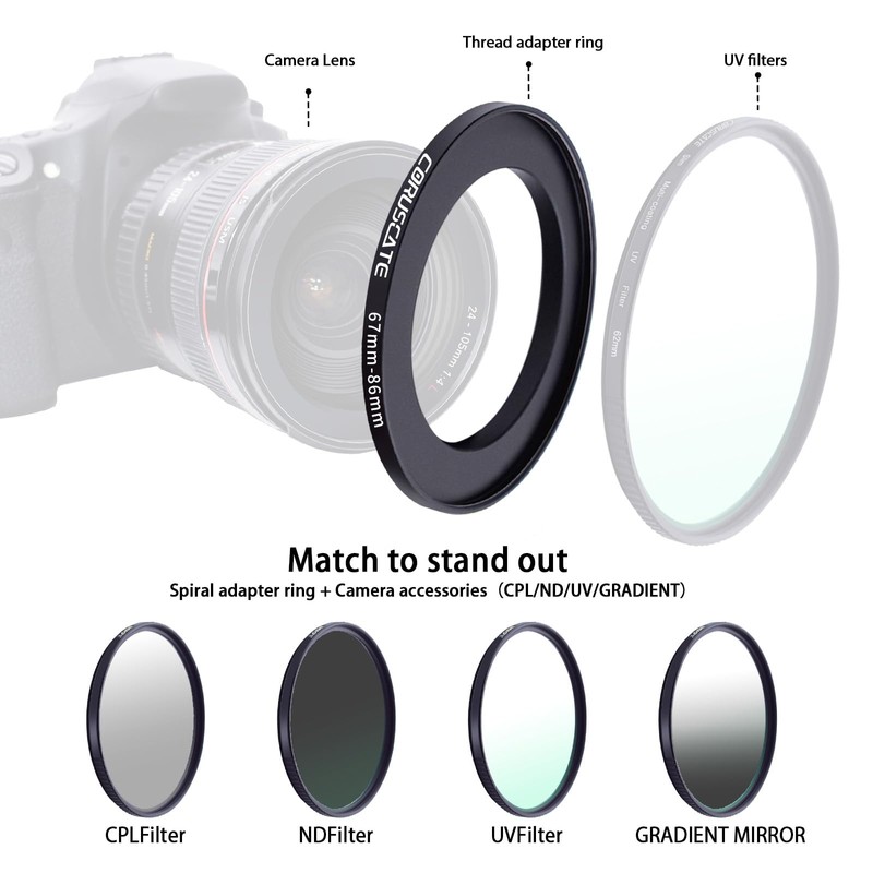 - Package includes: 1 x 67 mm - 86 mm camera filter ring + 1 x lens cleaning cloth + (original manufacturer package)
