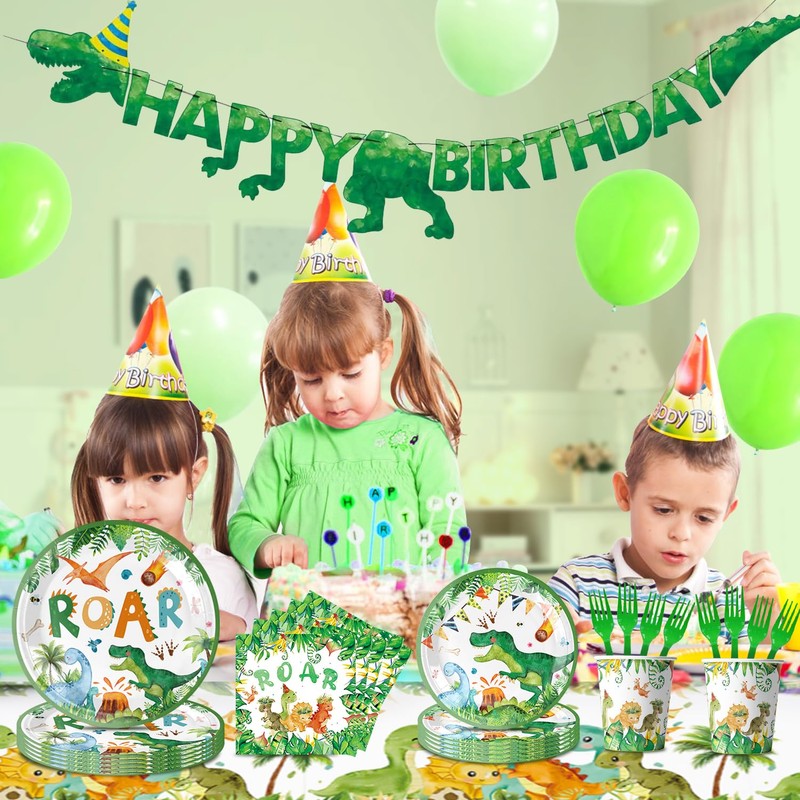 67 Pcs Dinosaur Tableware Set, Dinosaur Party Decorations for Girls Happy Birthday Banner Plates Napkins Cups Tablecloth for Dino Birthday Shower Party Decorations Supplies 10 Guests (10, Green)