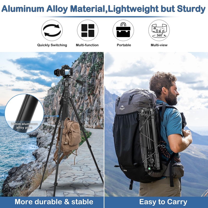 - 【Portable Tripod & Carry Bag】The tripod is only 3.85 lbs weight, Three aluminum alloy legs can be folded back with min storage size 16.5 inch, The portable carry bag make it easy for outdoor and travel photography, We additional 1/4" universal QR plate can support two devices quickly working, This tripod is a good choice for Photographer.