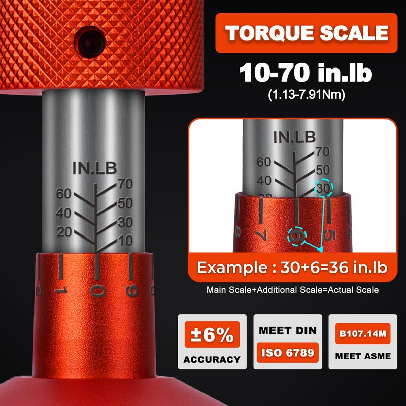 - Precision Torque Control (10-70 in-lb / 1.13-7.91 Nm): Professional-Grade Torque Screwdriver Kit. Dual-scale accuracy in 1 in-lb increments. Durable 40CR steel/aluminum body with clear orange/silver scale for sensitive tasks like machinery repair.