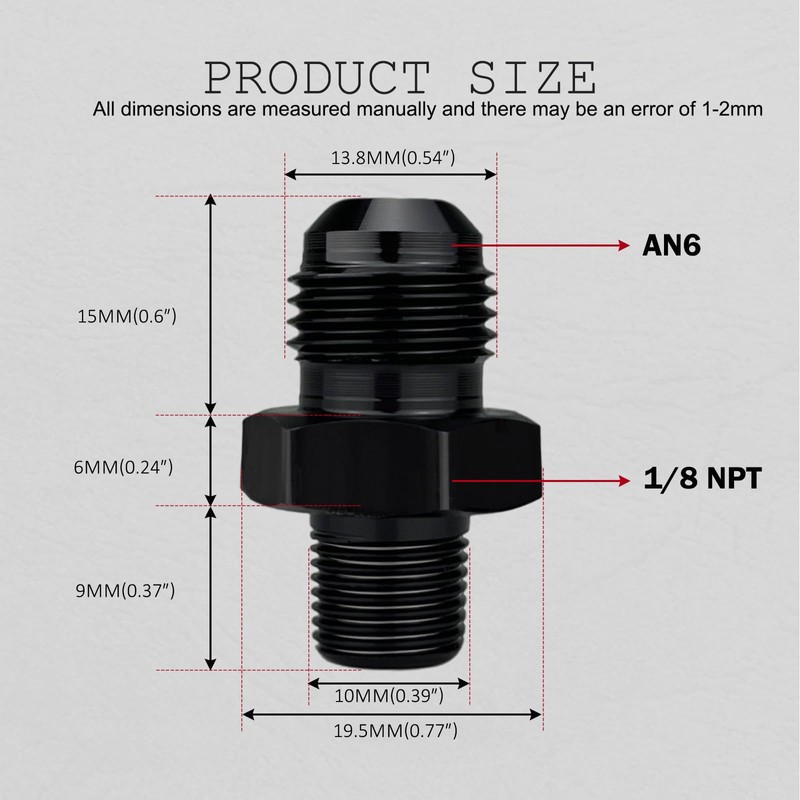 - Size: AN6 to 1/8" NPT, the thread size of 6AN is 9/16-18 UNF
