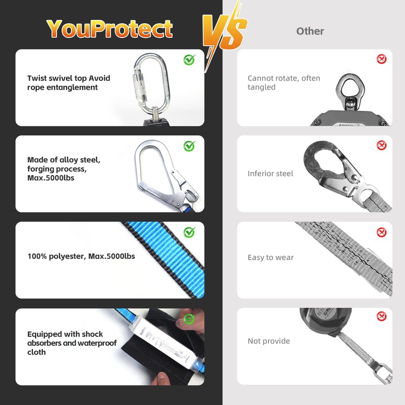 - OSHA ANSI COMPLIANT: Rigorously tested by an ILAC ISO 17025 accredited lab to ensure our products comply with industry standards. The Retractable Lanyard can be used for climbing on a roof or ladder, construction, roofing work and many other work scenarios