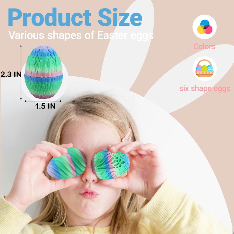 - 🎨【6 Vibrant 3D Printed Egg Styles】Each colorful dragon egg bursts with unique patterns! Mix & match styles to stash kids' tiny treasures: candies, toy cars, plushies, or surprise notes. (Size: 1.5"x1.5"x2.3" – fits little hands & Easter baskets perfectly!)