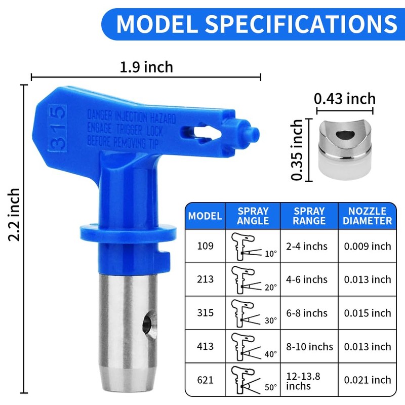 • 【Package contents】5 pcs different models of spray tips(109,213,315,413,621) ,Tip Guard and Airless Spray Tip Organizer