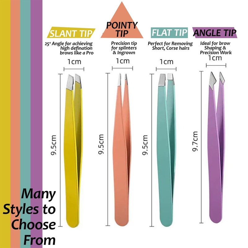 • 【4 DIFFERENT EYEBROW TWEEZERS FOR VARIOUS USING】4 different professional precision tweezers are included in this kit, range from Slant Tweezer​, Pointed Tweezer, Pointed-Slant Tweezer, Flat Tweezer. They can not only be used for eyebrow shaping, odd stray hairs/chin hairs removing, ingrown hairs/splinter/tick removing, but false lashes and double eyelid affixing, even for craft, jewelry-making, electronics, laboratory work etc.