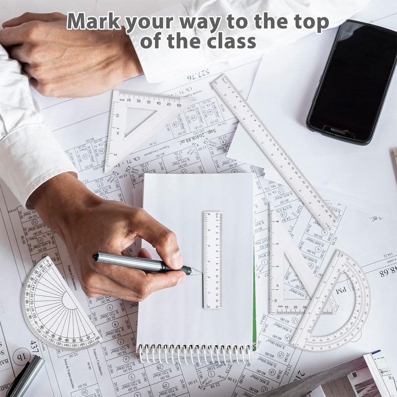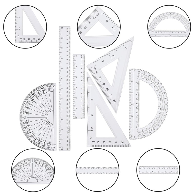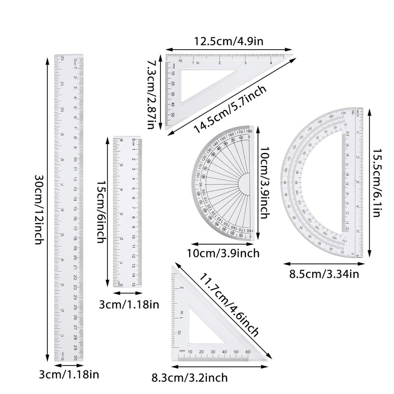 - Package Includes: 1 pcs 30 cm/ 12 inch straight ruler; 1 pcs 15 cm/ 6 inch straight ruler; 1 pcs 60°/ 30° triangle ruler; 1 pcs 45° triangle ruler; 1 pcs large semicircle protractor and 1 pcs small semicircle protractor