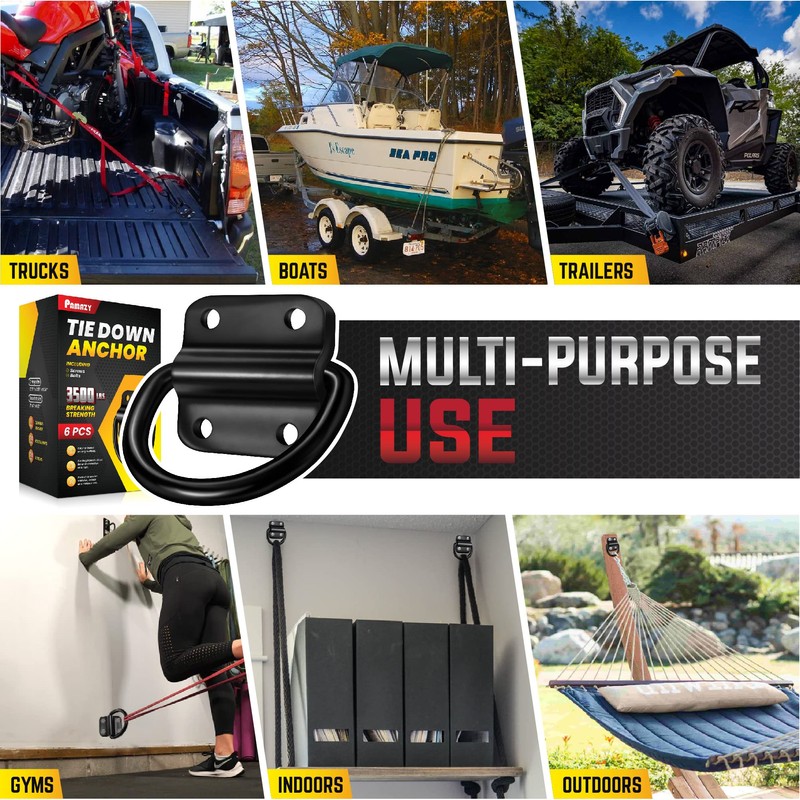 PAMAZY 6PCS Heavy Duty Steel D Rings Tie Down Anchors, Ultra Durable 3500 Pound Breaking Strength Surface Mount Hooks Securing Cargo for Trailer, Truck Bed, with Screws & Bolts