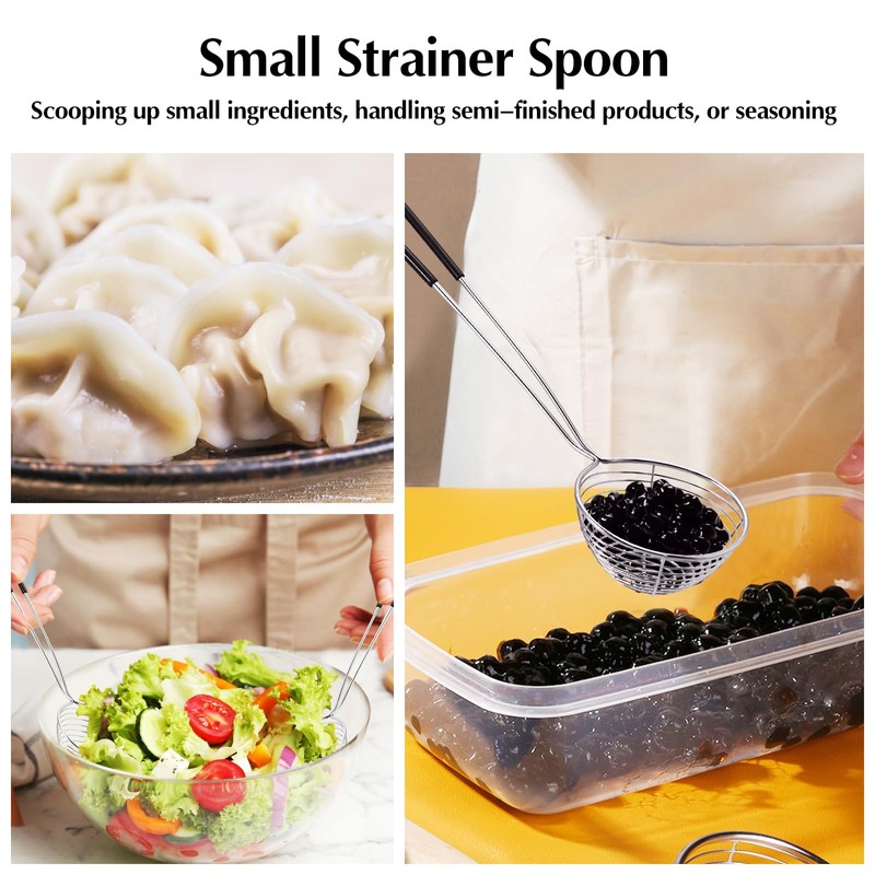 - Product Dimensions: The strainer spoon measures 10.82 inches*2.36 inches. The handle is covered with a layer of rubber, providing heat insulation and slip resistance. Its compact size makes it convenient to use.