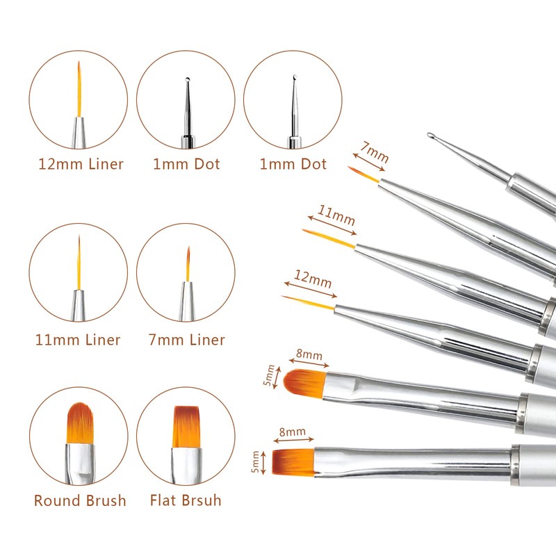 - 💞【ALUMINUM BRUSH WITH LID】This brush body is made of Silver Aluminum, which looks so exquisite and without flaws. Morevover, Each pen is equipped with a pratical lid. With the lid, you can better maintain brushes hair and store the brushes set well. When creating nail art, 6 different brushes are suitable for a lot nail painting design.