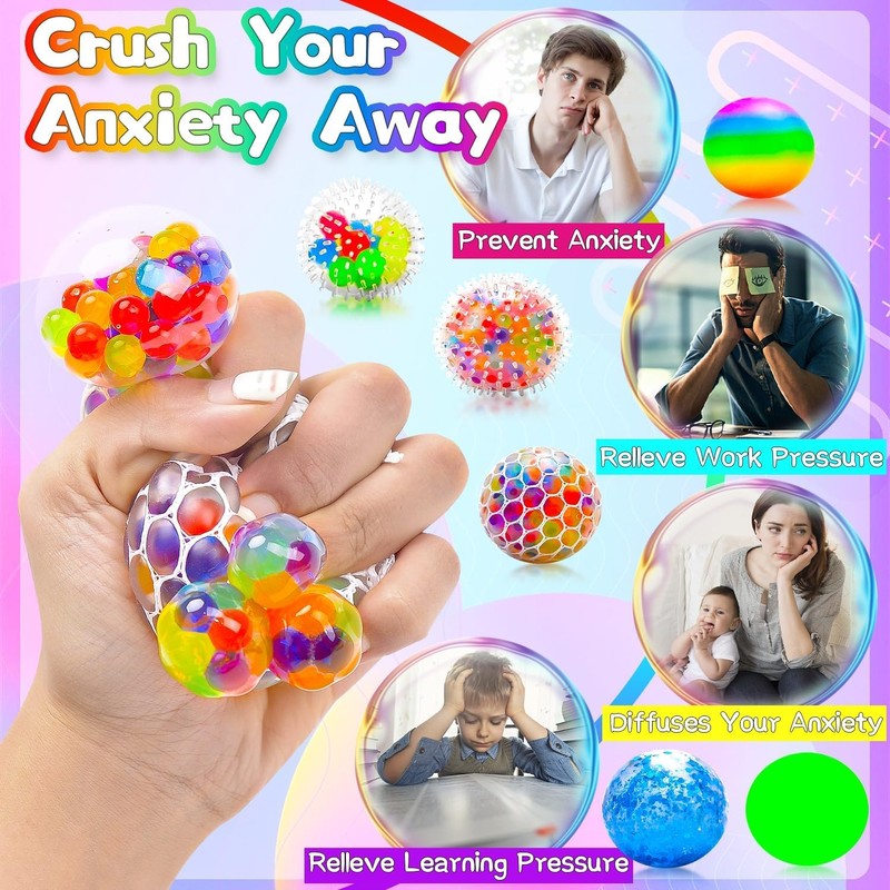 - 6 Pack Stress Balls for Kids & Adults: Looking for a great stress reliever or boredom toy for you or your child? Try this new sensory stress ball set. 6 different styles of Squeeze stress balls with 6 different sensory experiences. Playing these stress balls fidget toys can help people calm and increase focus. What's more, bright colors can help children acquire a strong sense of color, enhance their color cognition.