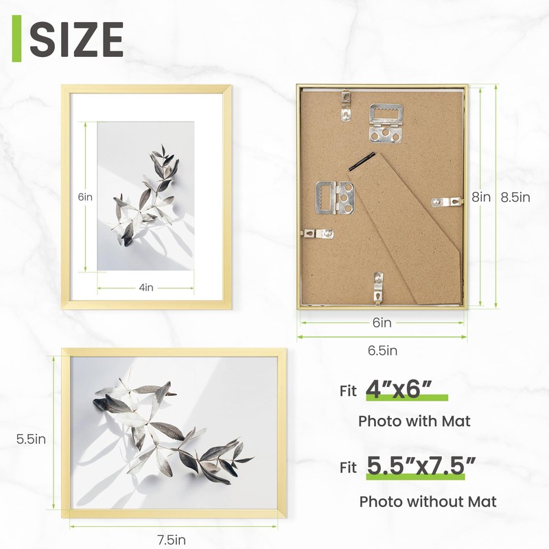 - Aluminum Picture Frames - Display your special monments in style with this 6 X 8 inch metal frame crafted from premium aluminum alloy. With a versatile size that display 6 X 8 inch pictures with a mat or 4 X 6 inch pictures without one. It's lightweight yet sturdy and durability with a superior quality finish, give you a perfect protection of your frames for preserving your memories.